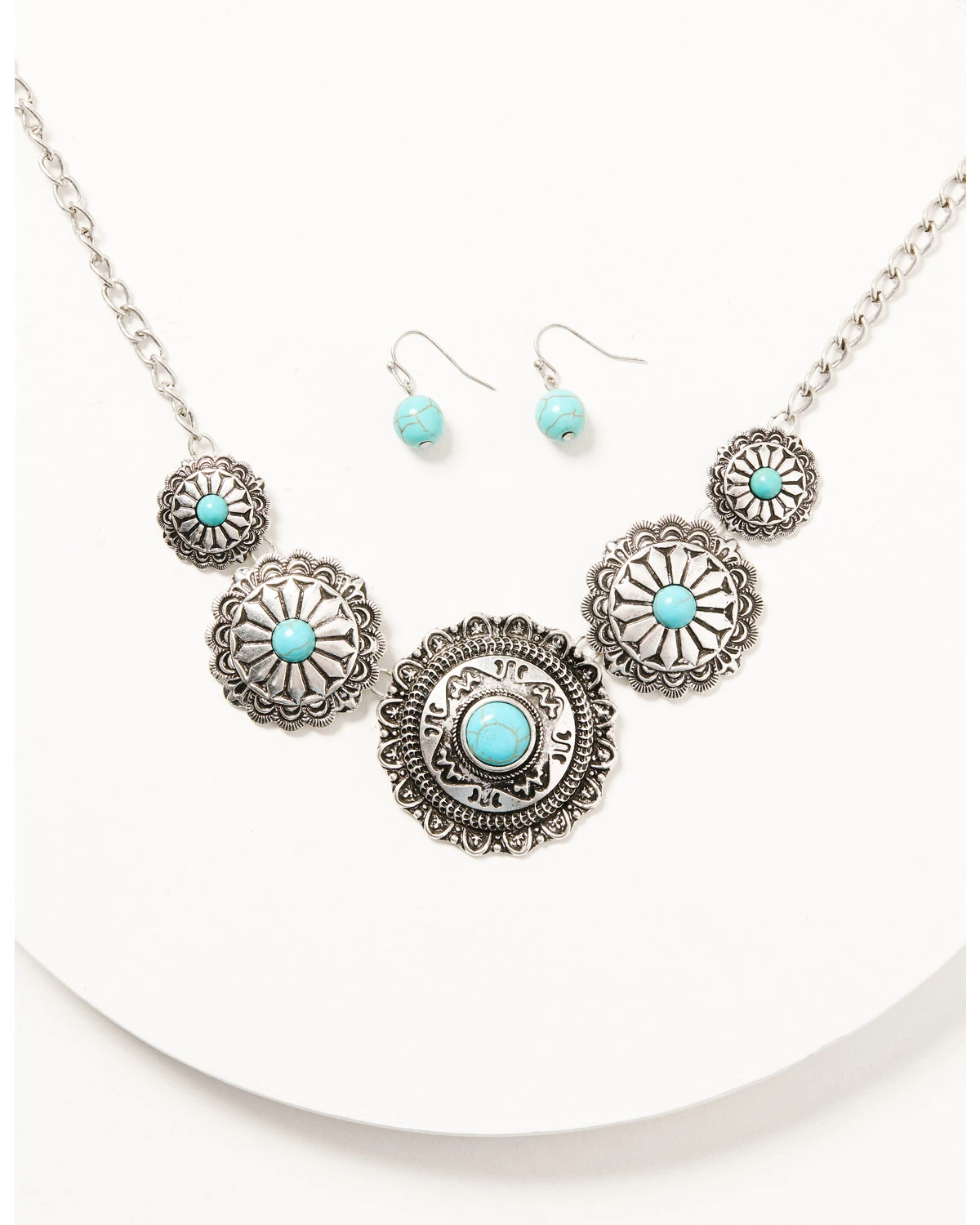 - Five multi-sized and varied-design conchos with turquoise centers